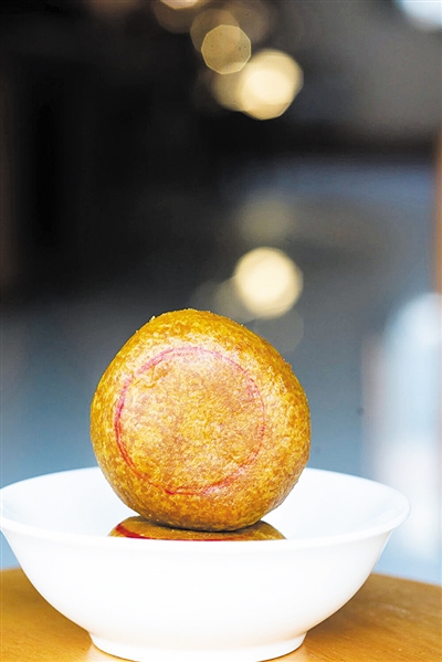 現在街巷里雖然看不見為“打月餅”而搭建的臨時帳篷,但混糖月餅依然是大同人中秋節的主角。趙富平說,老大同的月餅品類很豐富,除了尋常的混糖月餅,還有帶餡月餅。混糖月餅又有白糖月餅、紅糖月餅、冰糖月餅。帶餡月餅有提漿月餅、翻毛月餅、小大雜等等。老大同帶餡月餅中有一款名為“自來紅”的月餅,現已淡出人們的視線,鮮為人知。幾經周折,記者在采訪中發現,已有30多年歷史的林信齋還在制作、售賣“自來紅”。據林信齋的負責人介紹,“自來紅”又叫“豐收紅”,有著美好的寓意。因此,林信齋每年加工中秋月餅時都會制作“自來紅”。“自來紅”的餅皮用的是混糖月餅的面料,餡料是傳統的五仁餡。先包成稍小、但有厚度的圓餅,然后在圓餅上用食用色素蓋一個紅色的“圈章”,故稱“自來紅”。之后入烤箱烤制。“自來紅”皮酥餡軟,別有風味。
