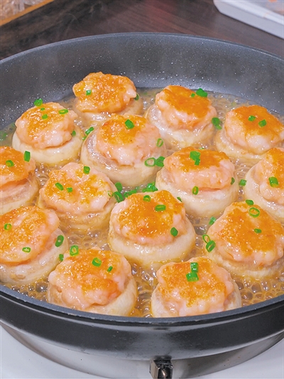 打開鍋蓋,轉大火收一下湯汁,關火后撒上切好的蔥綠,一道鮮軟入味的口蘑釀蝦滑就做好了。